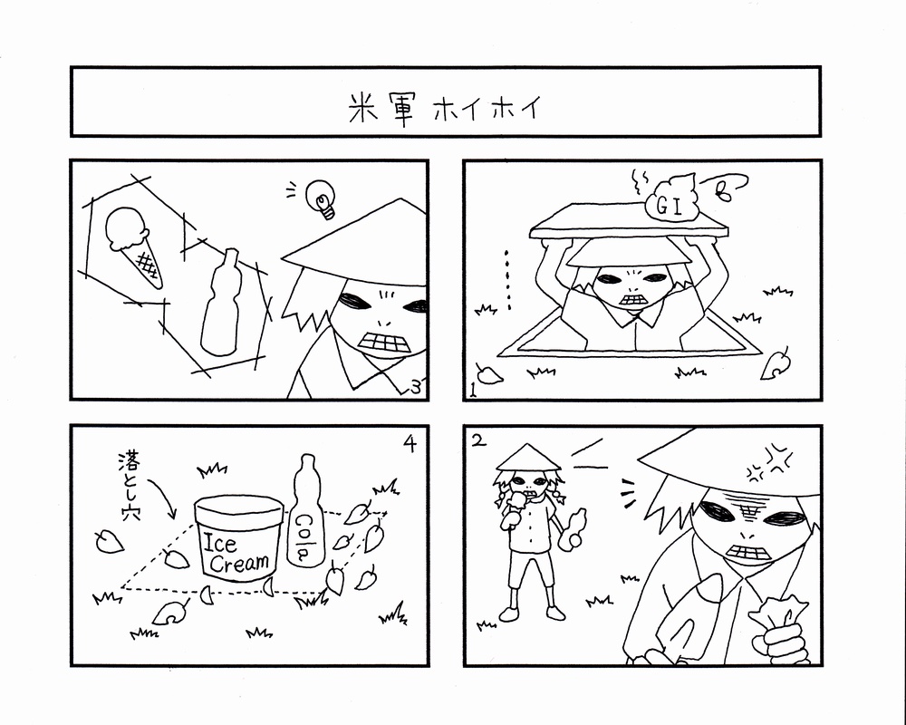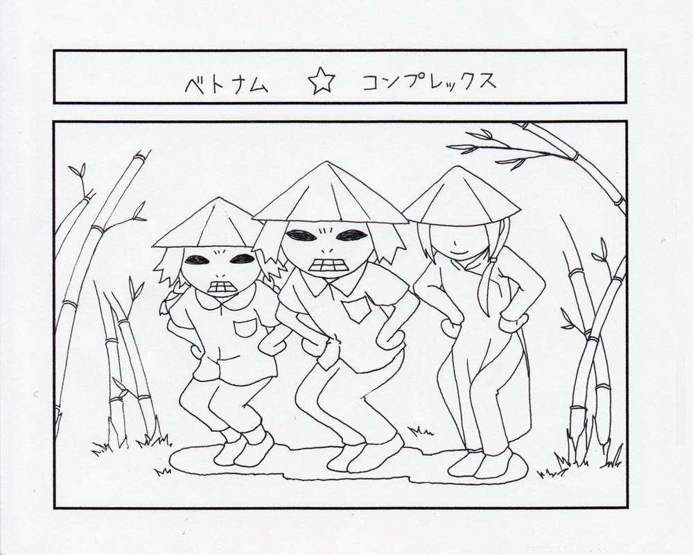 | アンチアメリカキャラとして生まれたベトコンのファンさん デザイナーのオムスビにベトコンのイメージでキャラを描いてもらったのが始まりでした いつも通りまったく資料の無いまま描き始めたオムスビ そして描きあがったベトコン 名前はイメージでファンさんに決定しました 後日、ノスタルジーパッチの参考にするため、ベトナム戦争時代のパッチ資料をあさってると こんなものが! ![]() ファンさんそっくり!? 今も昔もベトコンと言えば、この顔なんだなと思いました では、不定期連載漫画「ベトナム★コンプレックス」をどうぞ! |